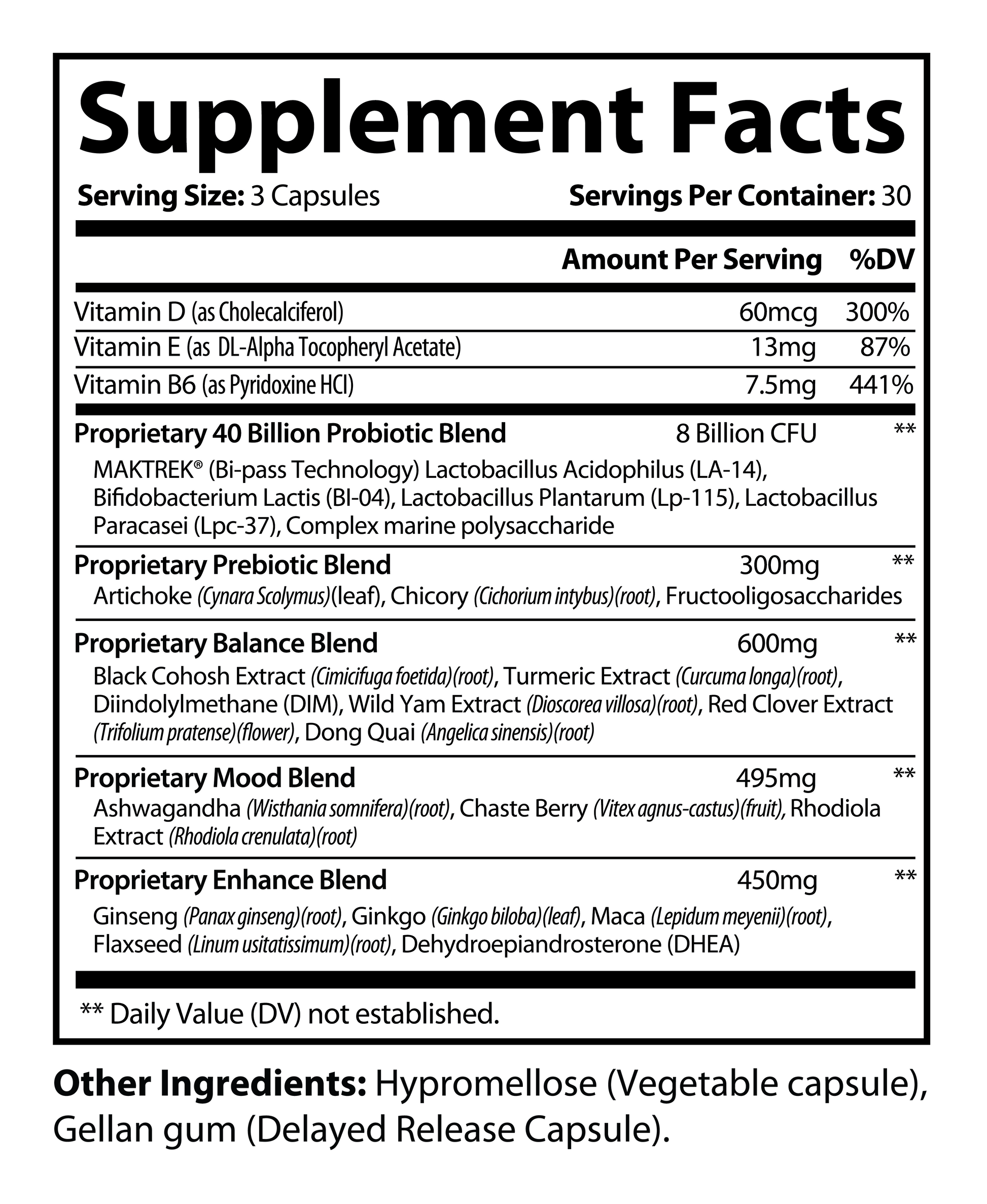 Comprehensive relief for menopause-related symptoms with hormone-balancing botanicals, probiotics, and mood support.